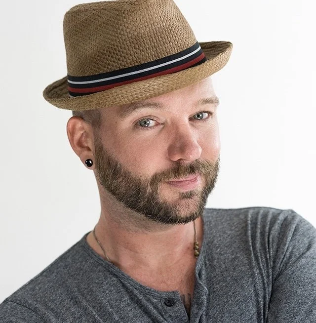 A man wearing a brown fedora hat with a striped band, gray shirt, and an earring, looking at the camera with a slight smile.